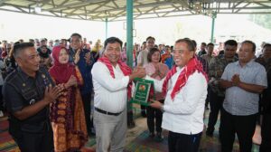 “Ikhlas,” jawab warga Desa Liang Pematang yang hadir di acara itu secara bersama-sama.