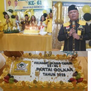 Peringatan Hari Ulang Tahun (HUT) ke-61 Partai Golongan Karya (Golkar) di Kabupaten Dairi berlangsung penuh makna dan kebersamaan. Selain diwarnai kegiatan ziarah ke makam pahlawan dan pembagian 650 paket sembako kepada masyarakat, rangkaian acara juga ditandai dengan pemotongan kue dan tumpeng sebagai simbol rasa syukur dan persatuan kader.
