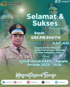 Ibnnews.co.id, Medan – Segenap jajaran Kantor Pertanahan Kota Medan menyampaikan ucapan selamat dan sukses atas terpilihnya Sri Pranoto, S.SiT., M.M sebagai Ketua Umum Konsorsium Ahli Pertanahan Indonesia (KAPTI-Agraria) untuk masa bakti tahun 2025–2028.